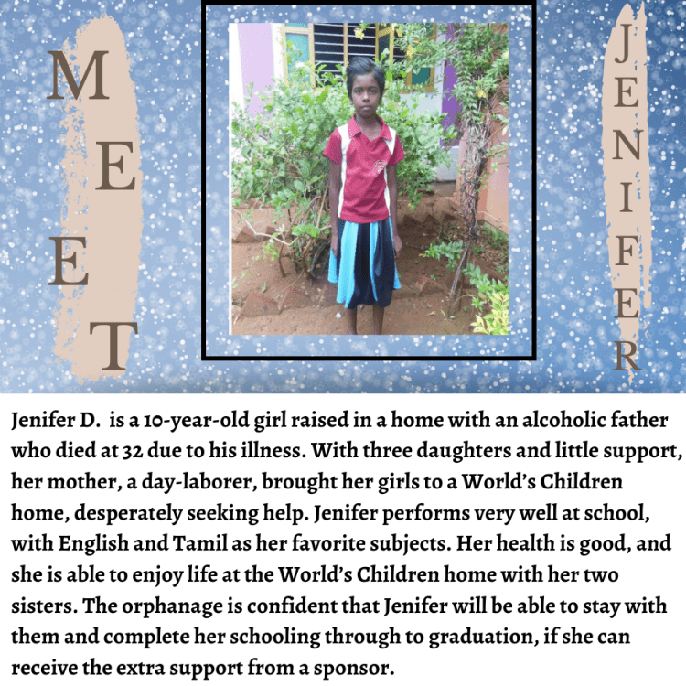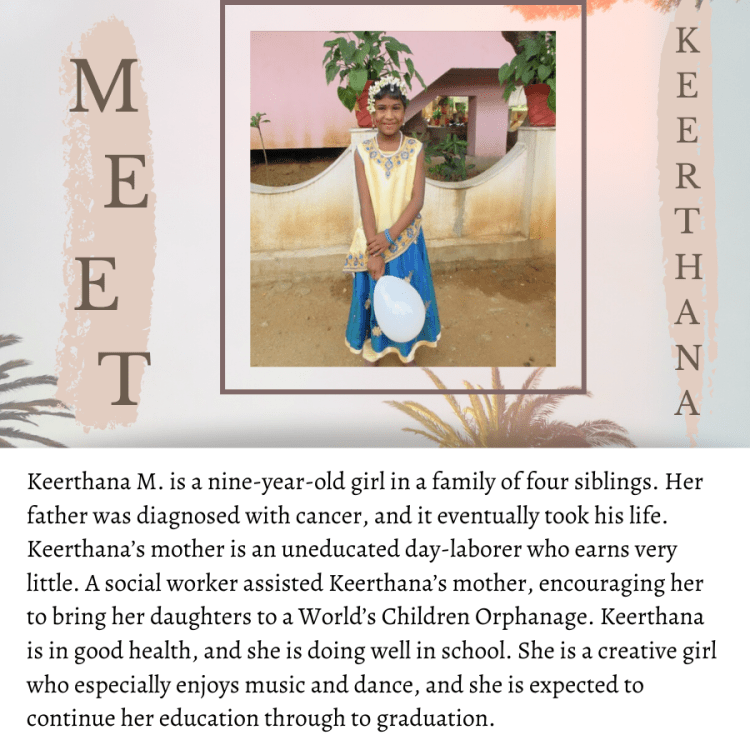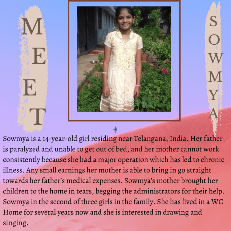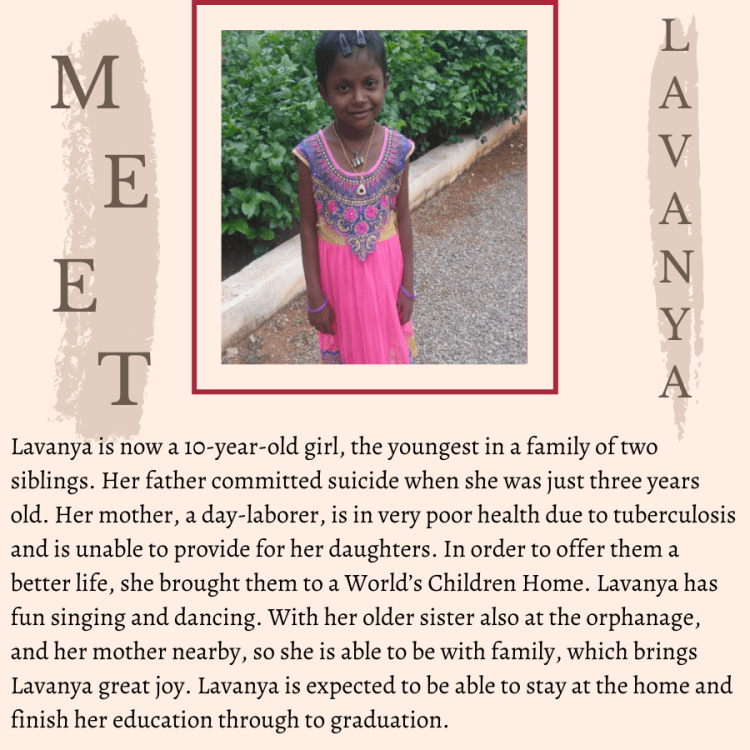 Chandu Kokkiligadda is a teenage girl living in the rural parts of Southern Andra Pradesh, India. Chandu and her older sister have been taken in by a World’s Children orphanage when she was only nine years old. Sponsored 5 years ago by the Yenduri family, Chandu now lives in an orphanage that provides for her education, shelter, and food all for the price of just $35. With the help of World’s Children, this beautiful 13 year old girl has the chance to be more than what her parents could’ve ever provided her with. She is now studying in Repalle, India within an academic institution and is able to chase her dream of becoming a nurse. We wish you all the best Chandu!