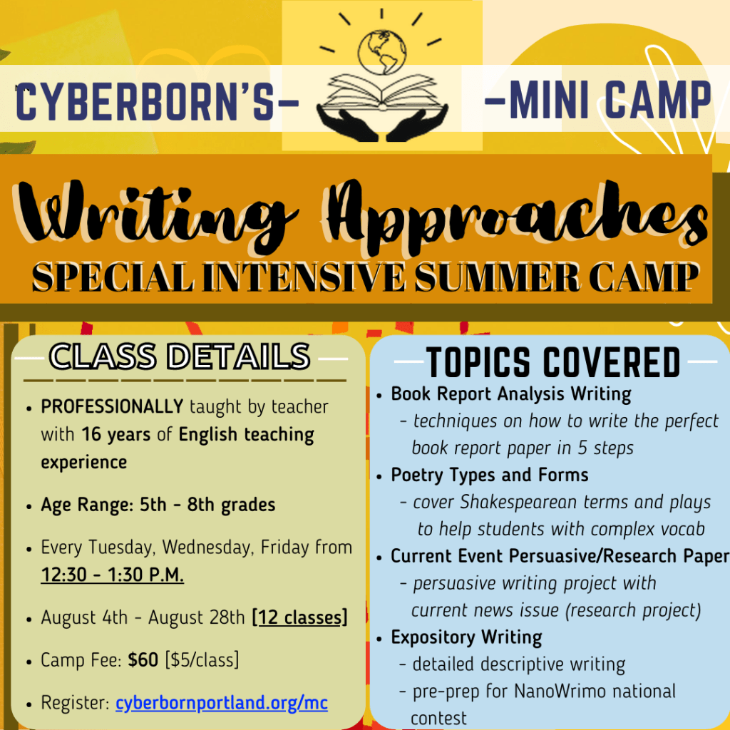 This writing camp is going to be taught by a retired teacher who has been teaching kids at school but also one-one-one tutoring for K-12 individuals for over 16 years in English and writing. The spots for this camp are also limited so register quick! Please click on the button below to be redirected to the sign-up form.